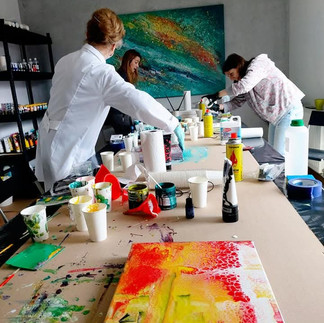 Wir arbeiten auf horizontal ausgerichteten Leinwänden, was dir ein freies Spiel mit fliessenden Farben und Schichten ermöglicht.